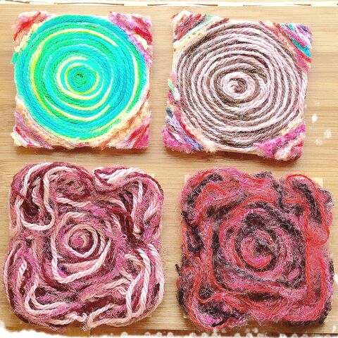 簡単 ダイソーのmdf材と毛糸で ほっこり 彩りコースター お花 渦巻き 暮らしニスタ